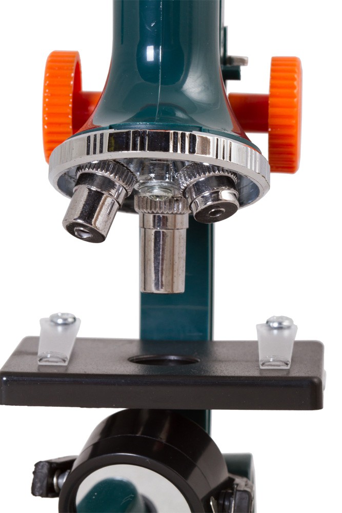 Микроскоп – это классический биологический микроскоп с нижней подсветкой. Его револьверное устройство рассчитано на 3 объектива. С комплектным окуляром микроскоп дает увеличение 150х, 450х и 900х. Изучать можно любые прозрачные объекты, например готовые микропрепараты.