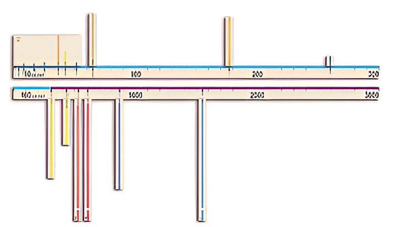 Изображения на карточках цветные, отпечатаны на магнитном виниле. Все шкалы имеют длину 1,5 м и деления через каждые 5 см. Три шкалы – линейные и имеют каждая свой масштаб расстояний (в одном делении 10, 100 и 10 000 св. лет соответственно). Две другие шкалы – логарифмические, одна в св. годах, другая – в км.