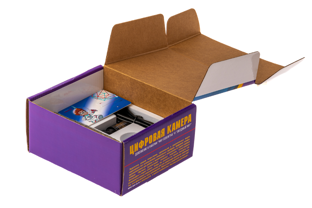 Микроскоп, набор препаратов, набор лабораторной оснастки и цифровая видеокамера имеют отдельные упаковки.