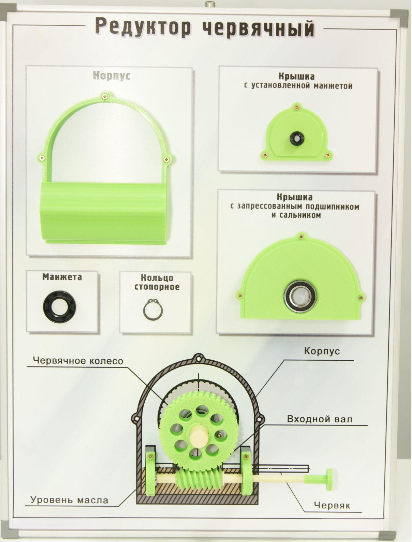 Планшет формата А2 с возможностью использования в настенном и настольном вариантах с закрепленными на нем всеми элементами червячного редуктора в разрезе в сборе. Позволяет изучать принцип действия и устройство редуктора. Червячная передача установлена вне корпуса с возможностью измерения геометрических параметров зацепления, определения передаточного отношения методами вращения вала и через числа зубьев зубчатых колес. Планшет изготовлен из фанеры толщиной 8 мм, с наклеенным на неё пластиком ПВХ 1мм с нанесением цветной термопечати. По периметру планшет окантован алюминиевым профилем. Верхний профиль имеет подвесы для крепления планшета к стене шурупами диаметром 3 мм.