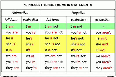 1. Таблица грамматических форм глагола BE в настоящем времени в утвердительных и отрицательных предложениях