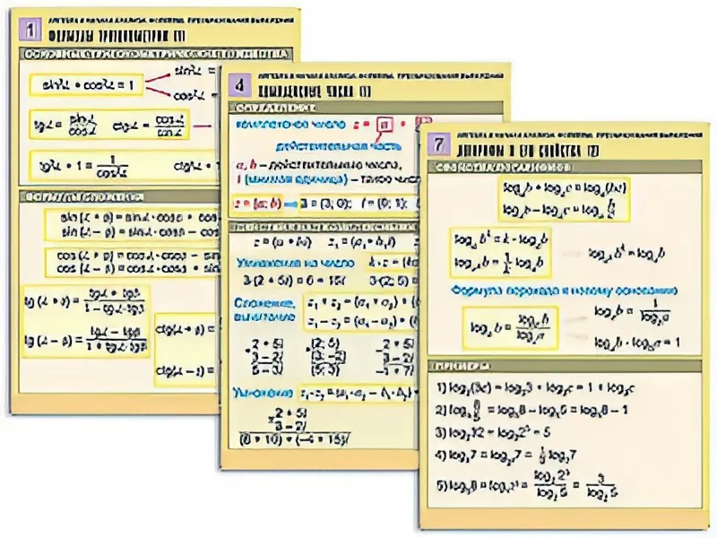 Комплект учебно-наглядных пособий "Алгебра и начала анализа. Формулы. Преобразования выражений"  формата А1 с полноцветной двухсторонней печатью и матовой двухсторонней ламинацией в количестве 8 таблиц.