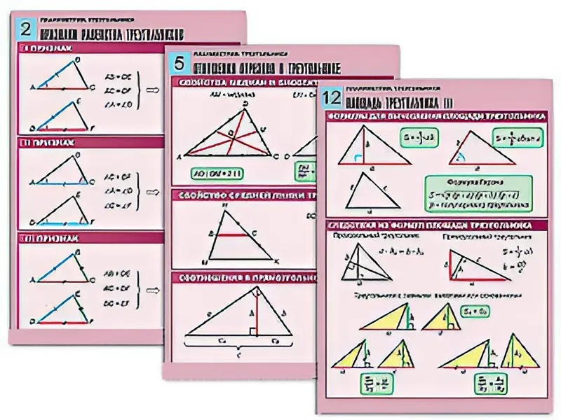 Комплект учебно-наглядных пособий "Планиметрия. Треугольники" формата А1 с полноцветной двухсторонней печатью и матовой двухсторонней ламинацией в количестве 14 таблиц.