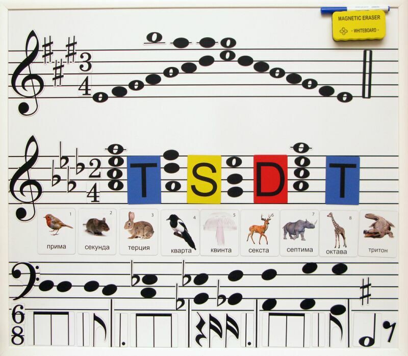 Эта магнитная доска с набором магнитных карточек может использоваться как в дошкольном учреждении на музыкальных занятиях, на уроках сольфеджио в музыкальной школе (фронтальная, групповая, самостоятельная работа), так и во внеурочной деятельности.