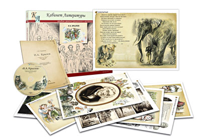 CD-диск пособия включает текстовый, изобразительный и аудио материал по двум темам: история развития жанра басни в России и творчество И.А. Крылова. В материалы диска вошли портреты представителей басенного жанра с комментариями; текстовые и иллюстративные материалы о творчестве И.А. Крылова, иллюстрации к его басням («Квартет», «Демьянова уха», «Лисица и виноград», «Стрекоза и Муравей», «Кукушка и петух» и др.), аудиозапись двадцати басен.