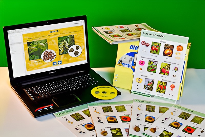 На планшете «Сухие плоды» представлены: боб (горох), стручок (горчица), семянка (подсолнечник), коробочка (мак), орех (лещина), зерновка (пшеница). На планшете «Сочные плоды» представлены: ягода (помидор, тыква), однокостянка (вишня), многокостянка (малина), яблоко (яблоня), многоорешек (шиповник). В информационном вкладыше описаны виды плодов и семян, особенности их строения.