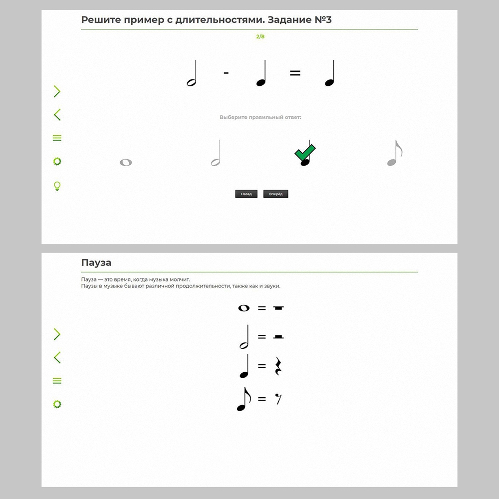 - обучающий материал (тексты, ноты, иллюстрации, аудио- и видеофрагменты);