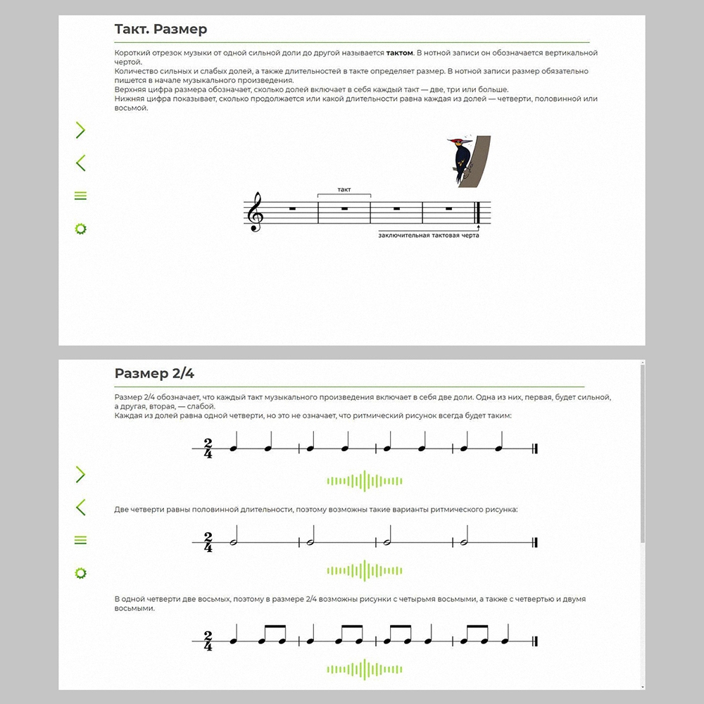 С помощью данного приложения можно освоить фундаментальные понятия, относящиеся к области метроритма (длительность, акцент, такт, простые размеры 2/4 и 3/4), выполнить различные виды интерактивных упражнений. Предусмотрено тестирование двух уровней сложности, а также представлены озвученные партитуры для музицирования на элементарных инструментах.