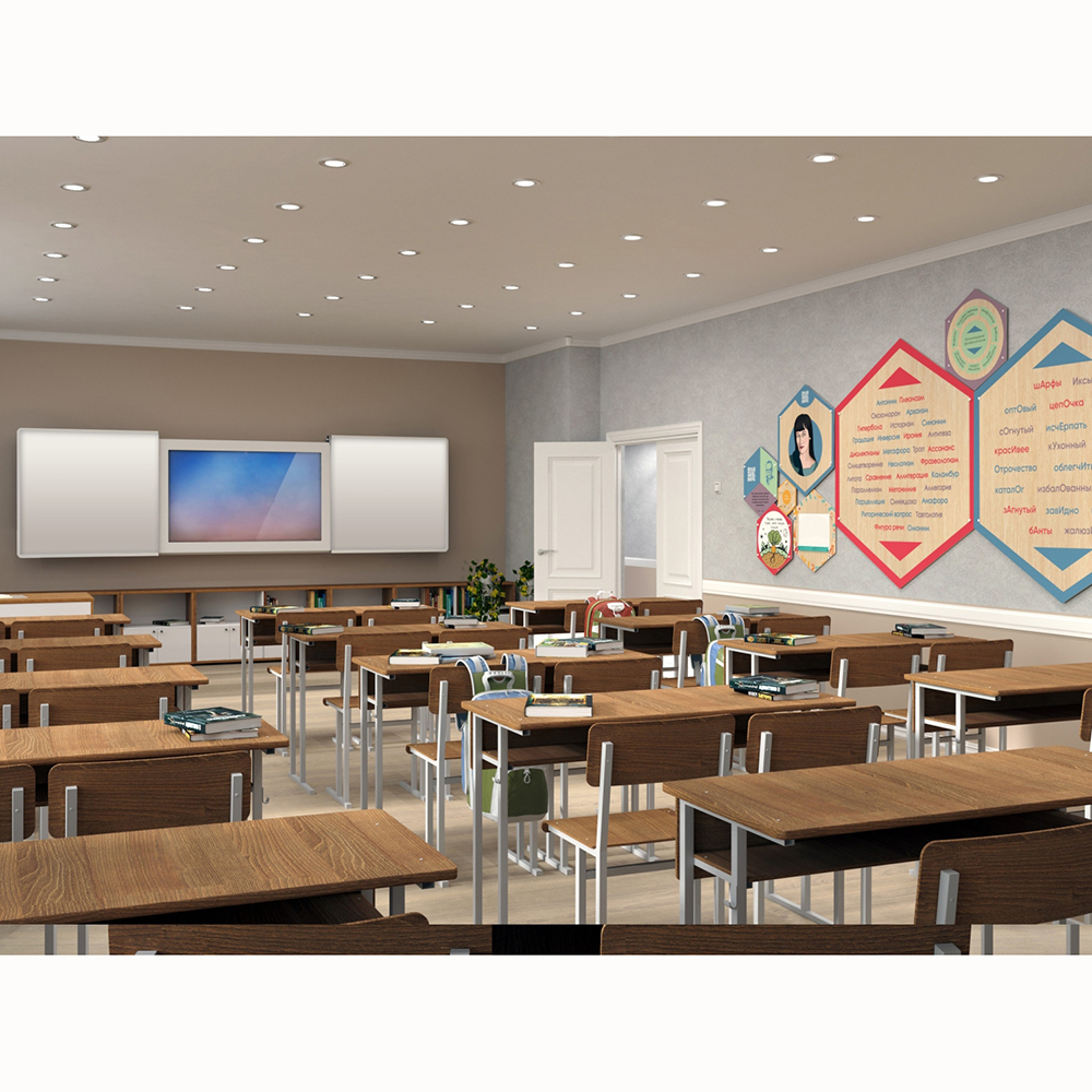 Современная школьная доска, сочетающая пишущую магнитно-маркерную поверхность и интерактивный экран со встроенным компьютером. Раздвижная конструкция доски «Фибоначчи» позволяет трансформировать рабочую зону по желанию преподавателя, и совмещать традиционные занятия от руки с инновационными инструментами в образовании. Подходит для оснащения школ, учреждений культуры, детских кружков, развивающих и коррекционных центров для детей.