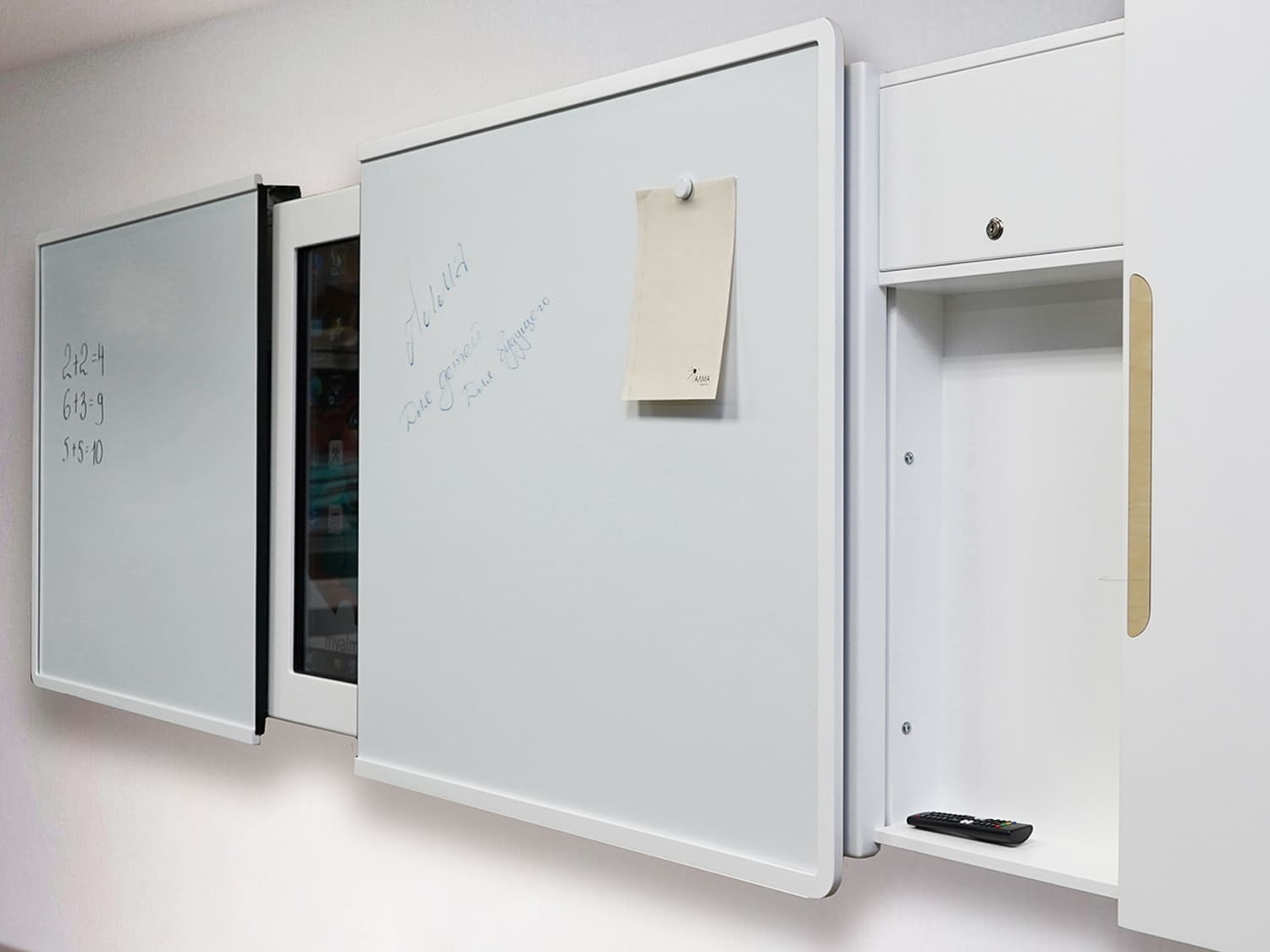 6. Удобство и эргономичность конструкции. Раздвижная система створок имеет прочную конструкцию и плавный ход благодаря доводчикам. По бокам интерактивной раздвижной доски находятся закрытые секции с полочками, где удобно хранить обучающий материал, маркеры, губки, пульты управления и прочий инвентарь, нужный для преподавательской работы. Запирающаяся на ключ секция, куда можно убрать ноутбук преподавателя, становится доступна при максимальном сдвигании двух магнитно-маркерных поверхностей в противоположную от секции сторону.