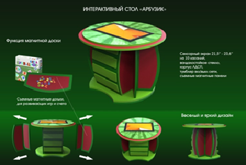 • Особенность стола «Арбузик» – в съемных панелях, стилизованных под арбузные дольки, с нанесенными методическими материалами
