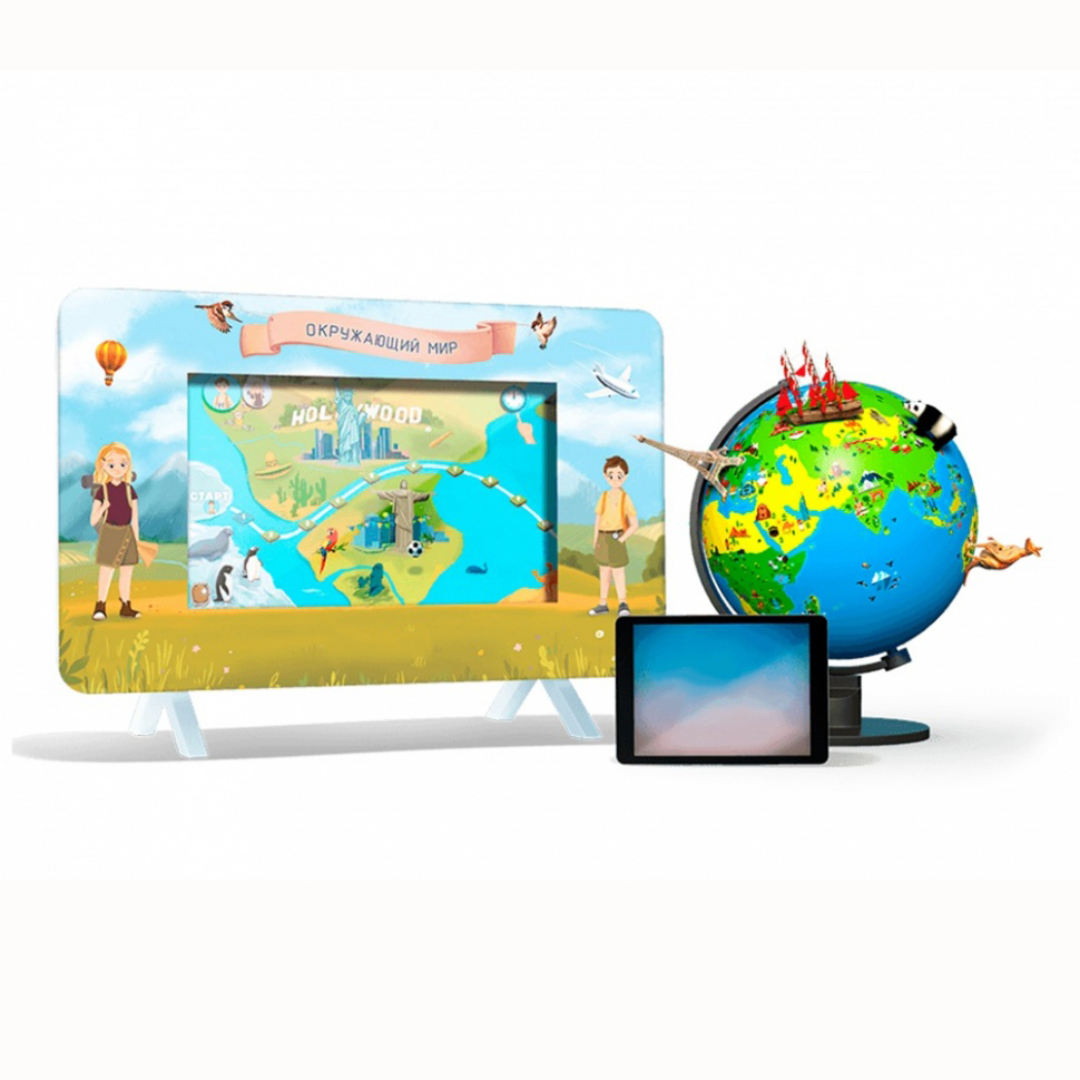 Программное обеспечение «География» в интерактивной игровой форме преподнесёт необходимый географический минимум, а глобус с дополненной реальностью, прилагаемый в наборе, отправит детей в кругосветное путешествие. Стоит только запустить на планшете специальное приложение и навести его на метки, размещённые на глобусе — картинки оживут, и о многих достопримечательностях появится интересная информация.