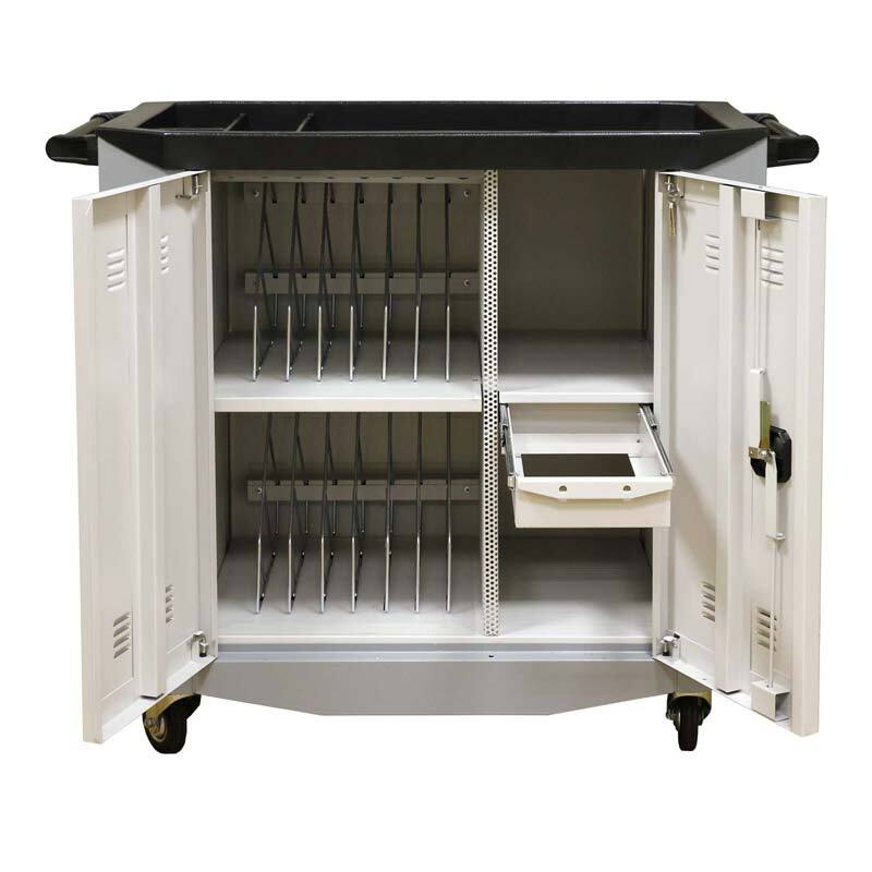 Тележка предназначена для зарядки и хранения ноутбуков и сформирована на базе металлического корпуса. Внутри корпуса размещены две полки которые разделены перфорированной перегородкой на четыре отделения. Два отделения снабжены сетчатыми перегородками и предназначены для хранения ноутбуков. Сетчатые перегородки съемные, позволяющие оптимально организовать внутреннее пространство, при количестве ноутбуков менее 16 штук. Максимальное количество ноутбуков по 8 штук на каждой полке.