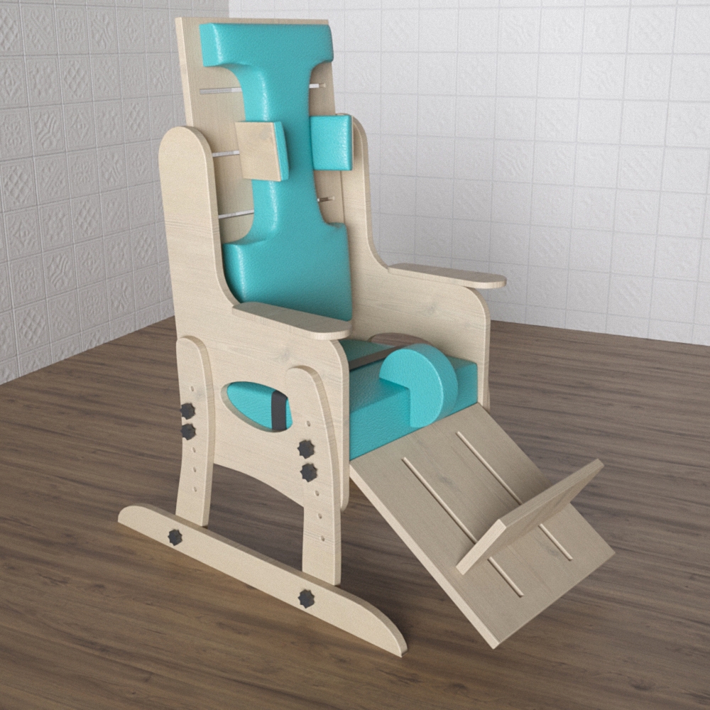 Конструкция стула была разработана с учётом всех особенностей вышеупомянутых особенностей и растущего детского организма - он имеет регулируемую подножку, что облегчает процесс привыкания к сидячему положению ребенка с нарушениями ОДА. Фиксаторы головы, подлокотники и подножку можно отрегулировать до нужной высоты; есть надежные ремни для стабилизации тазового пояса и верхней части ног ребенка. Предназначен для оборудования кабинетов специалистов, занимающихся реабилитацией детей с ОВЗ, учебных помещений в центрах коррекции и реабилитации.