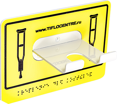 Универсальныйный травмобезопасный держатель для крепления одновременно 2х костылей или трости. Для слабовидящих - держатель трости контрастно выделяется яркой пиктограммой, а для тотально незрячих дополнительно нанесены рельефные надписи с применением системы Брайля. Держатель изготовлен из стали с нанесением порошковой краски. Рекомендован к применению ВОС, гос. программой "Доступная среда".