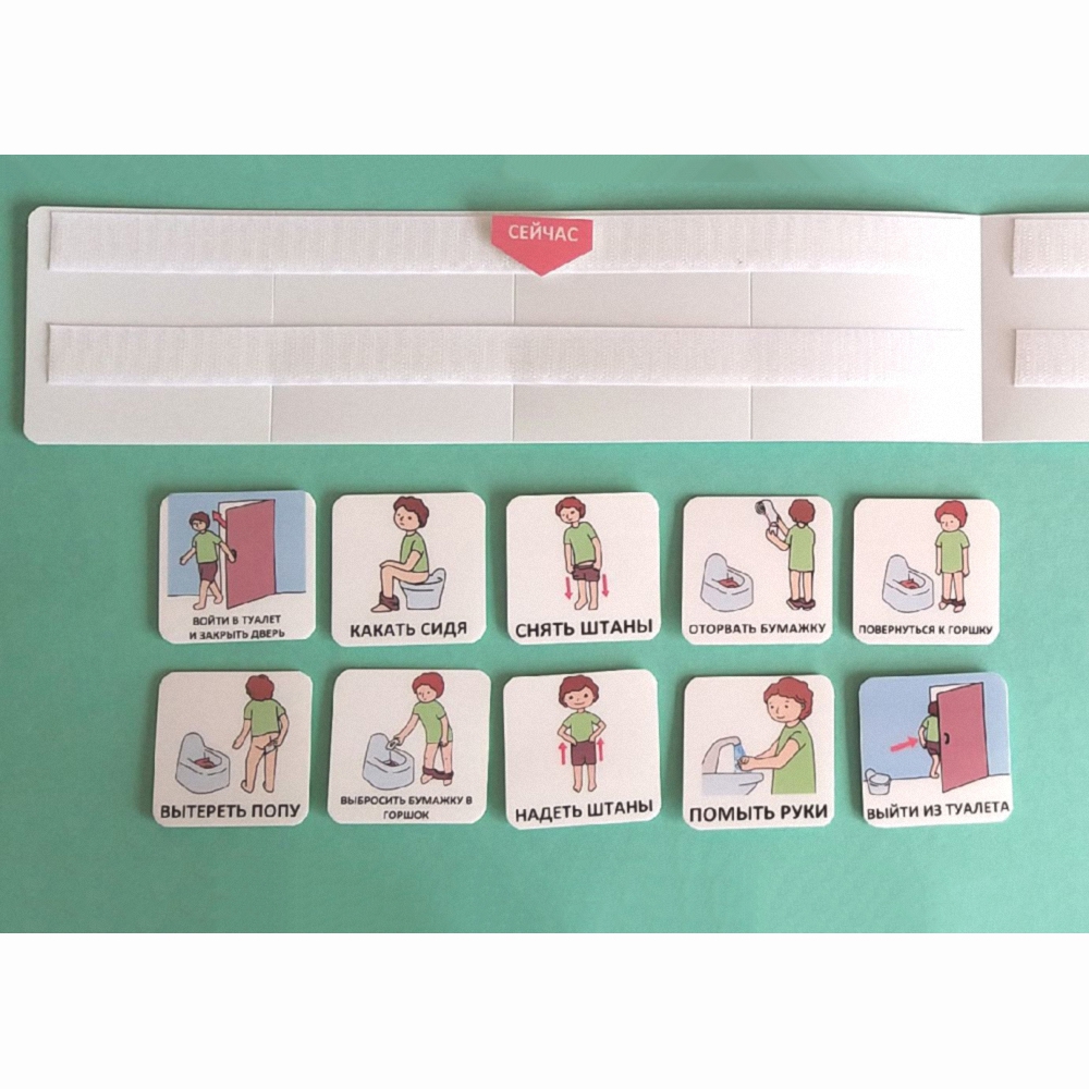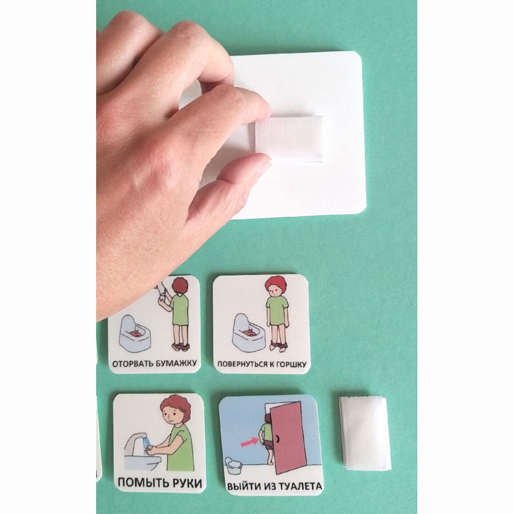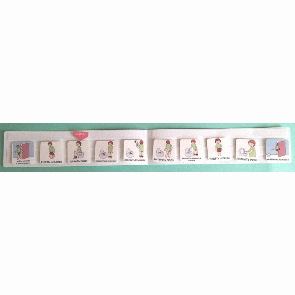 Благодаря съемным карточкам можно формировать сначала короткую последовательность по базовым навыкам: снять штаны, покакать, вытереть попу, надеть штаны. А потом переходить к более расширенным вариантам: добавлять карточки "оторвать бумажку, помыть руки, закрыть дверь и т.д.