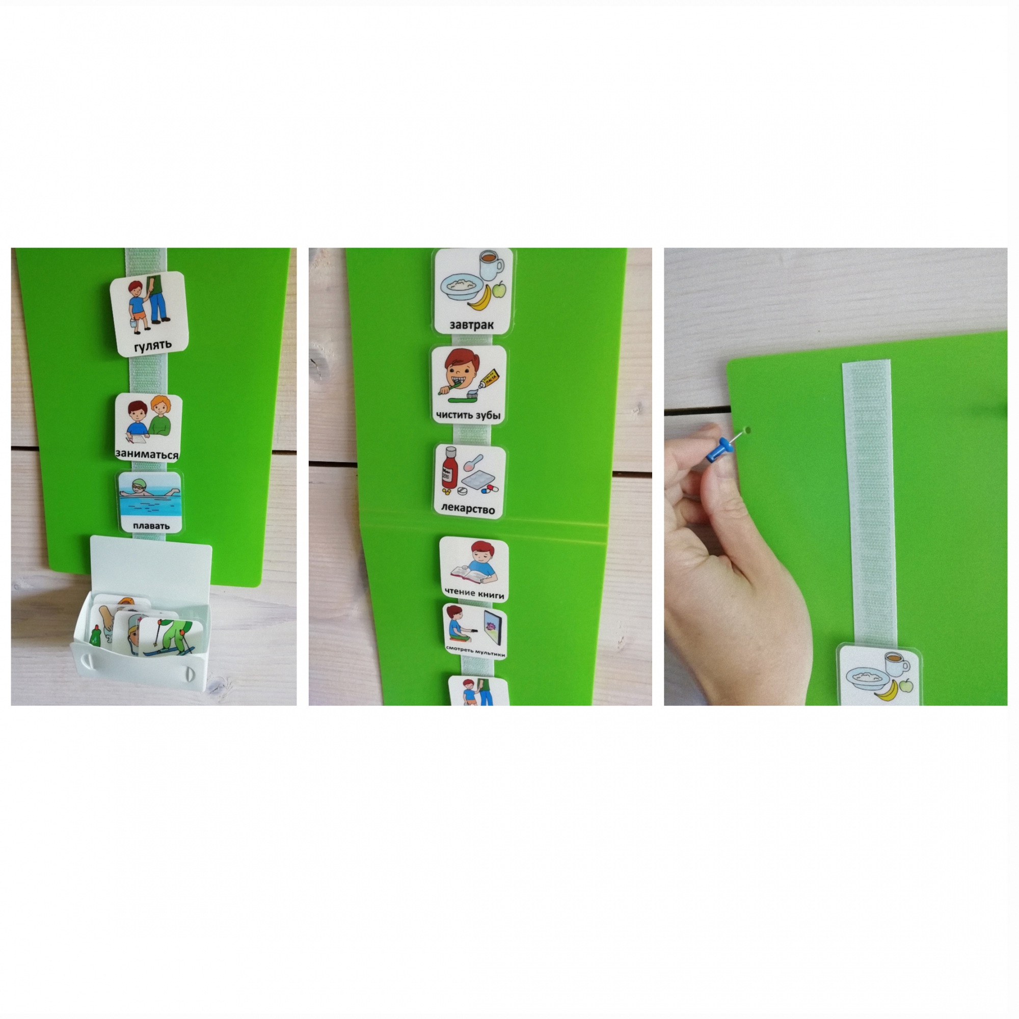 Ребёнок выполняет действия, начиная с самого верхнего. Выполненное действие убирается в контейнер. Таким образом, становится видно как список уменьшается, и какие ещё задания остались для выполнения.