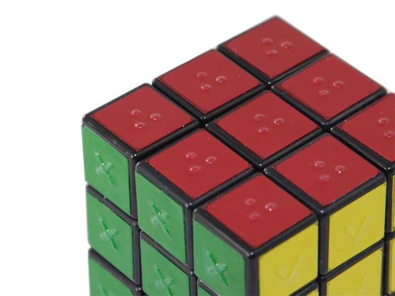 Головоломка представляет собой куб, составленный из кубиков меньшего размера, способных вращаться вокруг невидимых снаружи осей. Каждый из квадратов на каждой стороне куба окрашен в определенный цвет. В данной версии каждый цвет имеет определенное тактильное обозначение (кружочек, треугольник, точки и т.д.). Повороты сторон позволяют разными способами менять порядок цветных квадратов. Задача игрока – поворачивая стороны куба, составить их таким образом, чтобы каждая грань состояла из квадратов одного цвета.