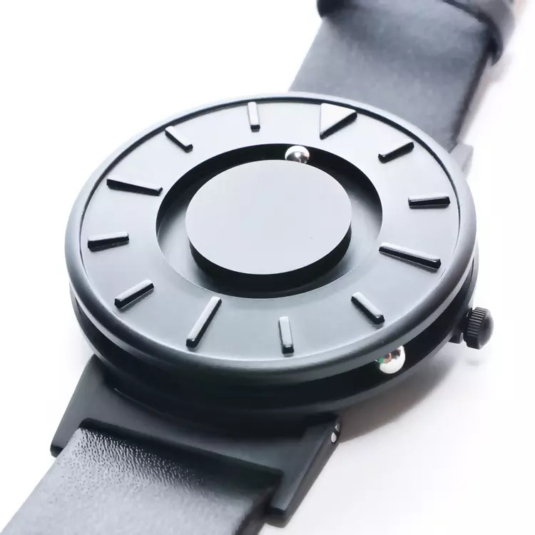 Уникальные стильные тактильные кварцевые часы вместо стрелок используют магнитные шарики, которые двигаются по круговым бороздкам. Первая находится на циферблате в специальной канве и указывает на минуты, вторая расположена сбоку на оси корпуса и отвечает за текущий час.