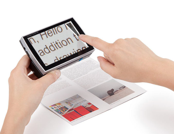 - Другой вариант использования Compact Touch HD при сложенной ручке — поставьте устройство на стол, и оно автоматически настроится на объект, который лежит под углом к нему. Тогда увеличение будет приблизительно 8-кратным. Это удобно для обеспечения стабильности при чтении текстов.