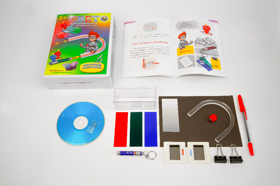 Набор предназначен для детей от 5 лет и старше. Благодаря понятному и объёмному методическому руководству ребёнок познакомится с понятием "свет", его эффектами и уже с младших классов будет понимать, как устроена световая волна, где она применяется и многое другое.