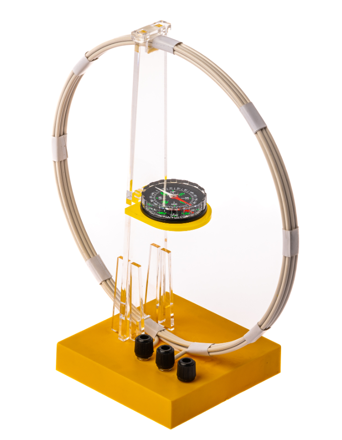 Прибор представляет собой катушку, которая подключается к источнику переменного тока, и при его включении в катушке образовывается магнитное поле. В центре катушки расположен компас с магнитной стрелой, на котором имеется шкала для отсчета угла поворота. Компас закреплен так, что линия шкалы совпадает с плоскостью катушки. Для того чтобы не искажать измеряемое магнитное поле, штатив набора изготовлен из немагнитных материалов.