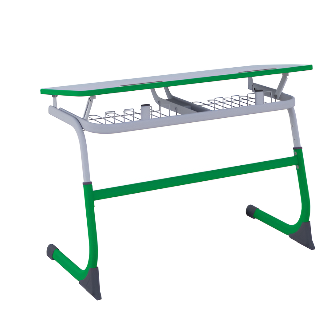 Парта SMARTY двухместная регулируемая по высоте с углом наклона столешницы, с антивандальной полиуретановой кромкой, металлическим основанием и кромкой ПВХ, имеет встроенные пластиковые пеналы и крючки.