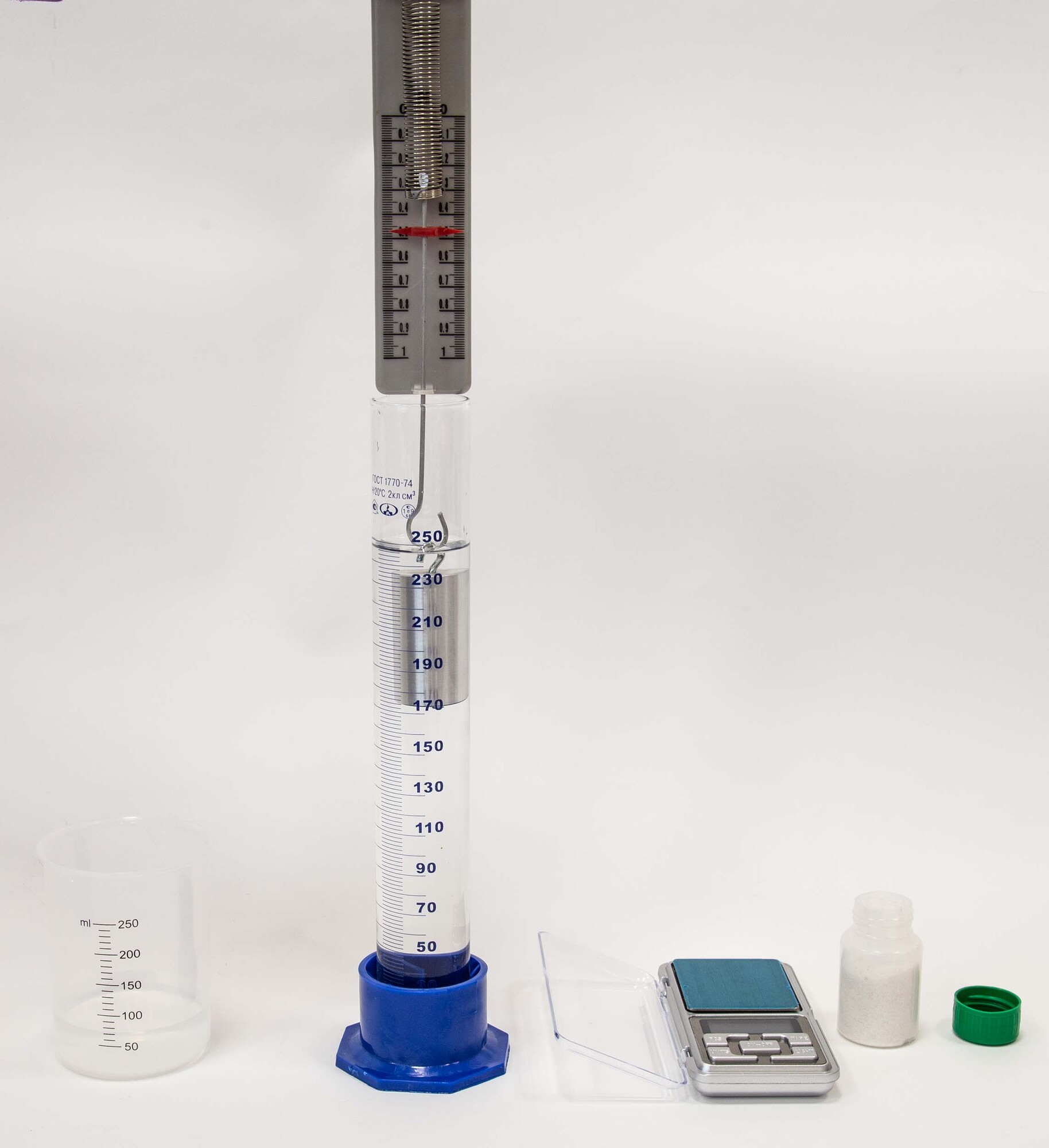 Комплект позволяет измерять среднюю плотность вещества и архимедову силу, исследовать зависимость архимедовой силы от объема погруженной части тела и плотности жидкости, а также независимость выталкивающей силы от массы тела.