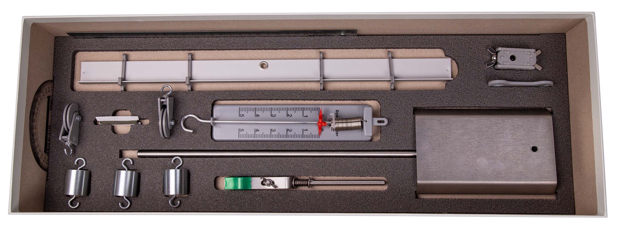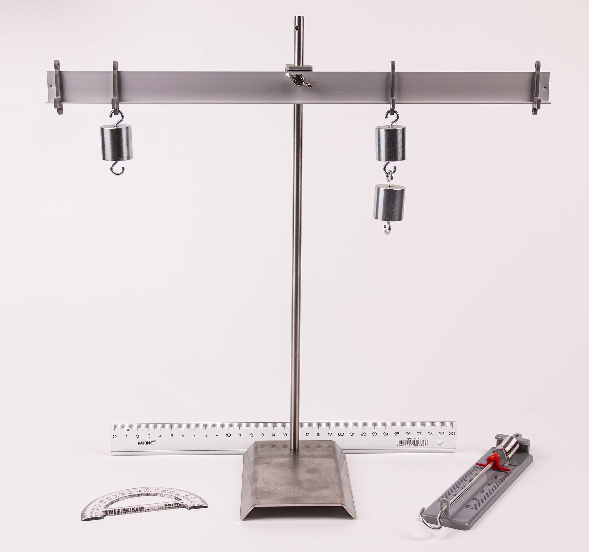 Комплект позволяет измерять момент силы, действующей на рычаг, работу силы упругости при подъеме груза с помощью неподвижного блока, работу силы упругости при подъеме груза с помощью подвижного блока, также проверить условия равновесия рычага.