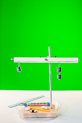 Штатив имеет деревянное основание, в которое вкручивается металлический стержень-трубка. Рычаг имеет четыре подвеса, которые можно свободно перемещать вдоль рычага, а также при необходимости снимать с него. К подвесам крепят грузы. Уравновешивают рычаг с помощью гаек на торцевых шпильках. Ось рычага – металлическая трубка – крепится в муфте штатива. Неподвижный блок закреплен на оси, которая крепится в муфте штатива.