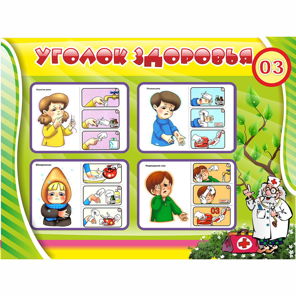 Как рассказать ребенку о первой помощи в разных ситуациях? В этом помогут наглядные картинки из нашего стенда. Стенд имеет четыре тематические картинки, которые рассказывают малышам о правилах первой помощи при колотых и резаных ранах, обморожении и попадании постороннего предмета в глаз.
