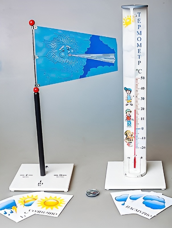 Набор представляет собой демонстрационные модели приборов термометра и флюгера, адаптированные для использования в дошкольных образовательных организациях. На карточках формата А6 представлены погодные явления («Солнечно», «Облачно», «Пасмурно», «Дождь», «Снег», «Гроза»). Карточки изготовлены из картона и ламинированы пленкой.