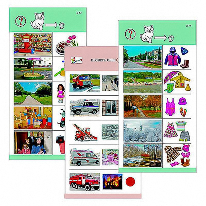 Пособие состоит из 10 полноцветных, напечатанных на картоне и ламинированных пленкой карточек. Является частью игрового набора "Обучающий калейдоскоп для дошкольного образования".