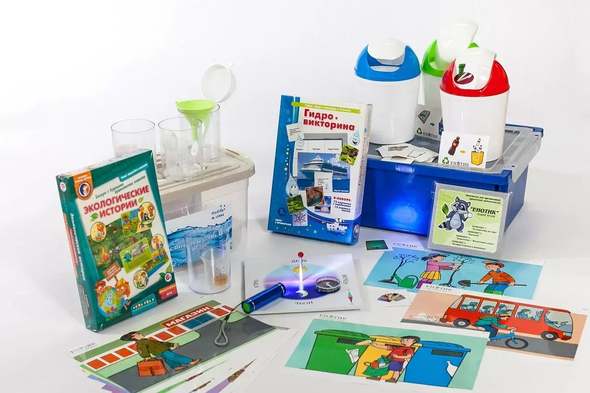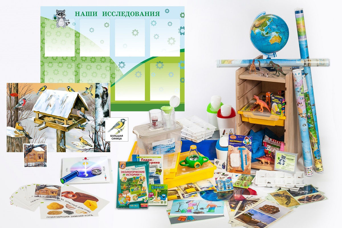 - Комплект № 2 «Экология». В комплект входят демонстрационные и раздаточные материалы: магнитные плакаты-аппликации. Комплект содержит: поле, комплект карточек с изображениями, карточки «Воздействие человека на окружающую среду», набор для наблюдения за природой, лабораторные приборы и оборудование для экспериментирования с водой, модель солнечных часов, муляжи, видео-контент, журнал проекта.