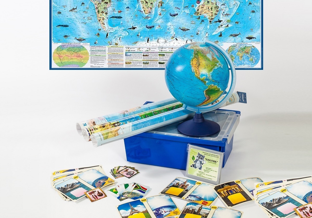 - Комплект № 1 «Путешествие по миру». В комплект входят наглядно-дидактические материалы для индивидуальной и групповой работы с детьми дошкольного возраста: глобус, карты, карточки с заданиями, видео-контент, журнал проекта.