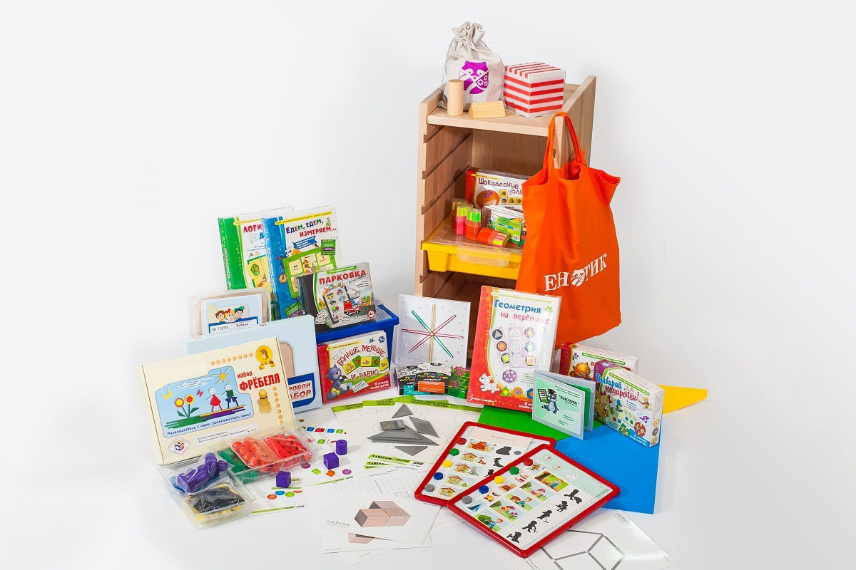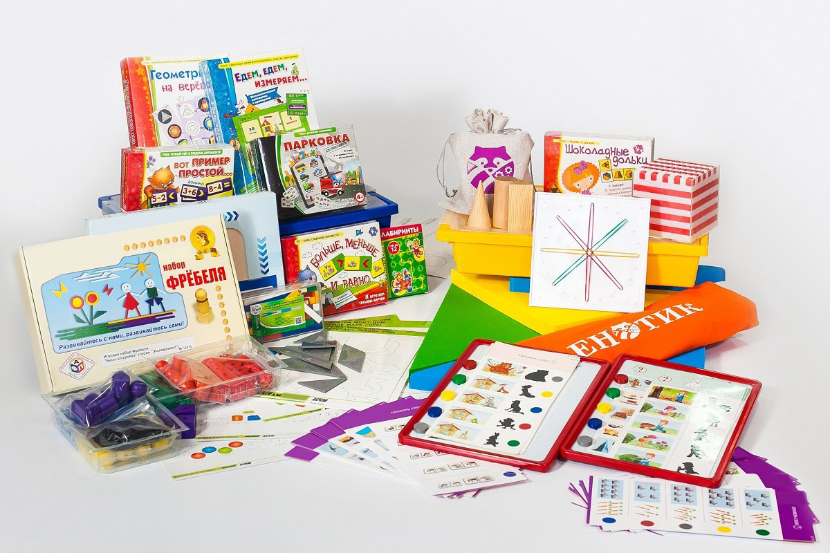 - Комплект № 1 «Математика». В состав комплекта входят числовая линейка, набор к числовой линейке, модель единицы измерения, комплект «Бусы» (счет в пределах 10-ти) с карточками-заданиями, набор объемных тел, настольные и напольные игры, карточки с заданиями, «Обучающий планшет ДО» или аналог, комплект карточек с заданиями по теме «Цифры и числа», видео-контент, журнал проекта.