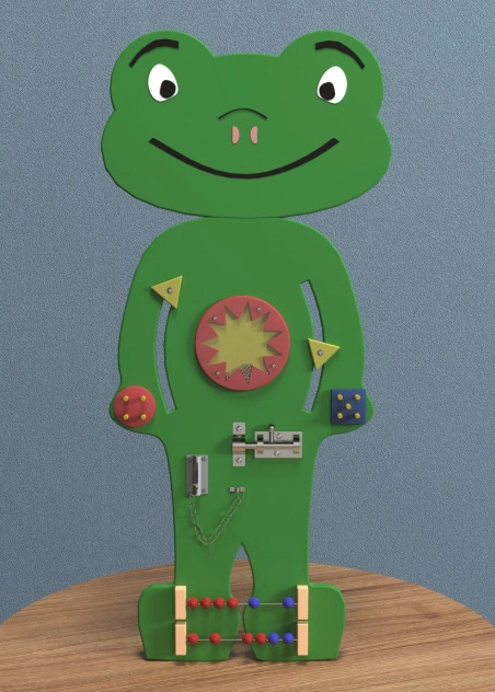 Это бизиборд, который будет интересен и увлекателен, для детей разных возрастов. Форма и изображение лягушки познакомить ребенка с миром животных, особенно интересен будет, как персонаж из сказки. Благодаря производителю доска безопасна и не имеет острых углов, не оставляет заусенцы на коже малыша. Недорогой бизиборд можно купить для домашнего использования, для детских центров, детских садов, для ресторанов и клиник.