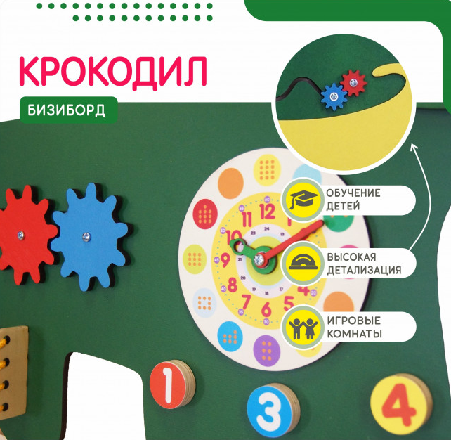 Бизиборд в виде зеленого крокодильчика прекрасно подойдет для занятий с детьми в дошкольный учреждениях, школах, а также детских центрах, радуя детей изо дня в день, как в большой компании, так и в одиночестве.