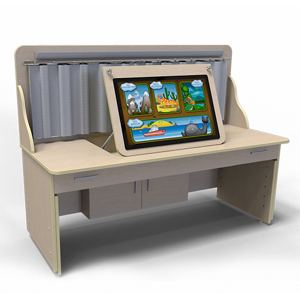 За счет регулировки высоты стол подходит для работы с детьми от 3 до 14 лет с нормальным развитием или с ОВЗ, ОНР. Его корпус выполнен из ламинированной ДСП, которая безопасна для малышей, так как не выделяет токсичных веществ. Комплекс оборудован зеркалом размером 1180х390 мм и двумя занавесами для него.