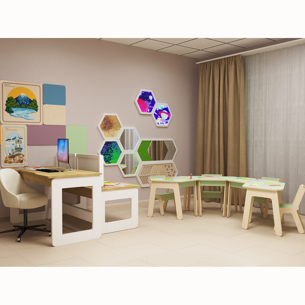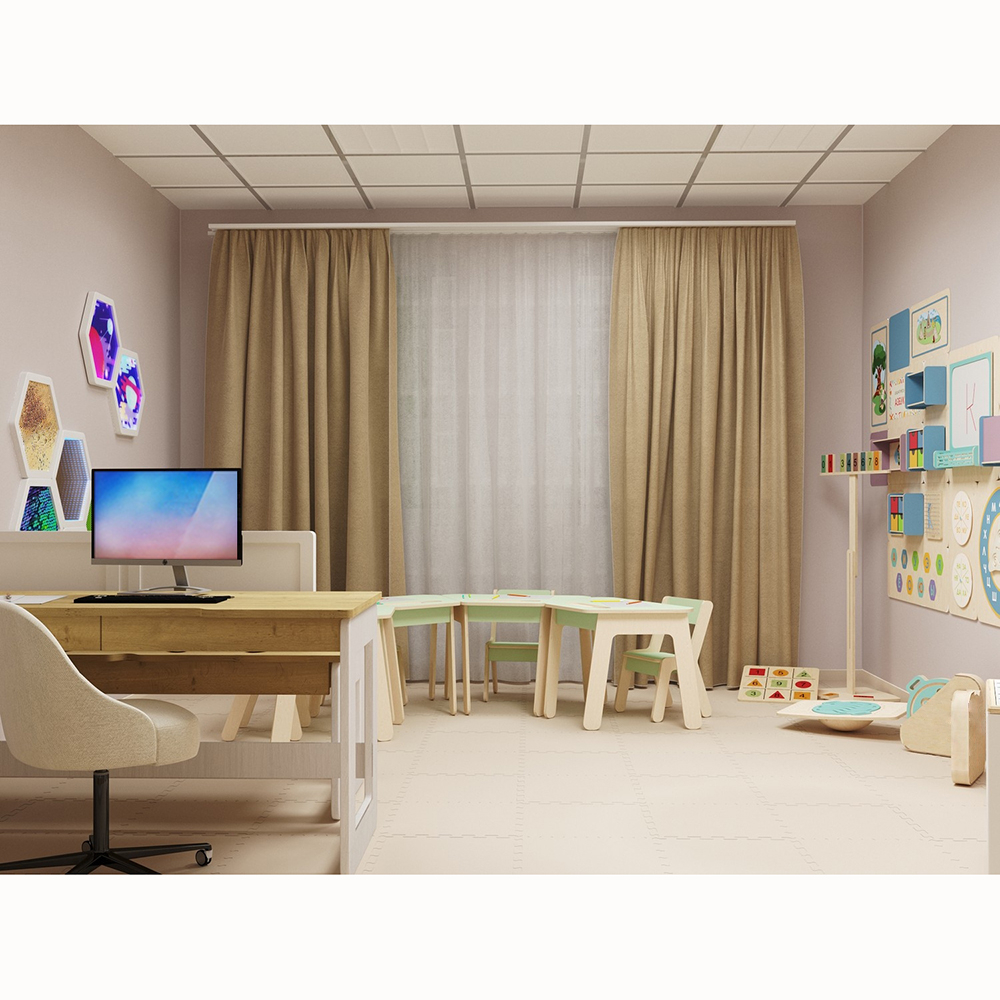 Если здание детского сада или коррекционного центра построено давно, там может не быть предусмотрено отдельных кабинетов для таких сотрудников, тогда универсальный кабинет будет отличным выходом из положения. Наша компания позаботилась о рациональном планировании рабочего пространства, так чтобы оно было многофункциональным, способствующим успешному коррекционно-образовательному процессу, и вместе с тем эстетичным и комфортным для юных посетителей.