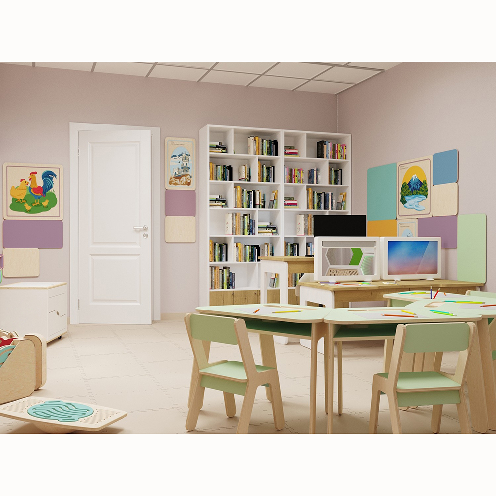 - Эстетика и единый стиль. В кабинете специалистов, занимающихся психологической и коррекционно-речевой помощью малышам, должен быть располагающий дружелюбный микроклимат. Готовое предложение решает эту задачу: внешний вид мебели и товаров гармонично сочетаются между собой, создавая единый стиль помещения и нейтральную, комфортную атмосферу.