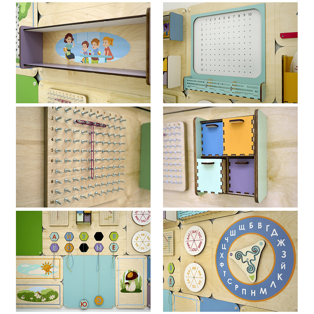 Дидактические панели отлично дополняют наборы цветных и иллюстрированных стеновых панелей, которые позволят оформить всё помещение в едином стиле.
