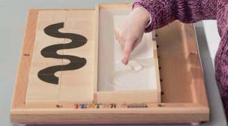Поддон для песка с крышкой (577×158× 40 мм), инструмент для выравнивания песка, 1 кг белого кварцевого песка в упаковке. На крышке поддона можно разместить 16 деревянных пластин размером 70×70 мм. Ребенок выкладывает образцы линий в крышке, несколько раз проводит пальцем по получившейся дорожке, а затем повторяет ее, проводя пальцем по песку, а потом уже придумывает свои линии на песке.
