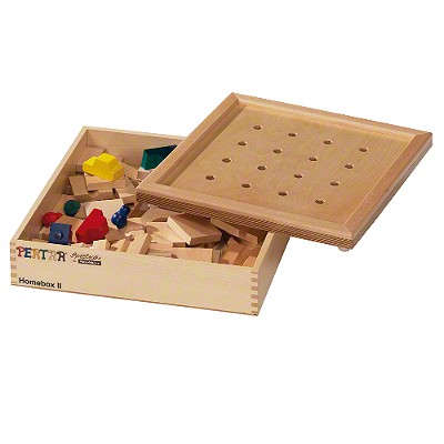 В наборе 86 деталей в коробке (409×409×150 мм) с крышкой, являющейся также доской-основой с 16 отверстиями.