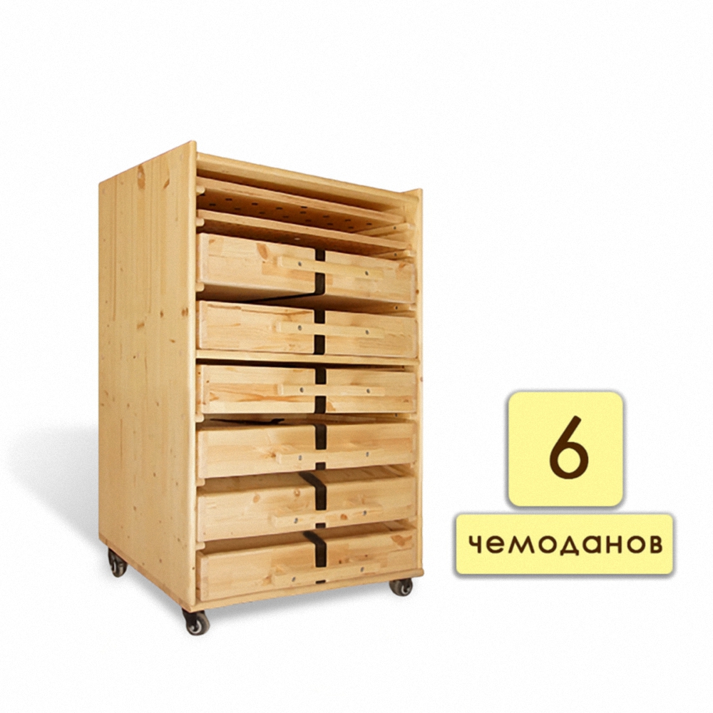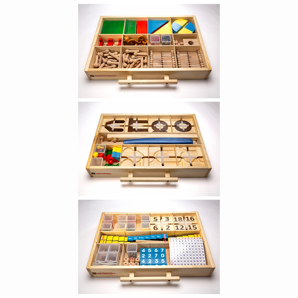 Все компоненты, входящие в набор, компактно располагаются в деревянном стеллаже. Удобный в использовании шкафчик имеет небольшие колесики, поэтому специалист без труда может перемещать его во время работы с детьми.