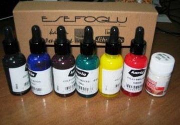 Краски состоят из натурального пигмента, воды и желчи. Они очень жидкие, почти цветная вода, и поэтому легко растекаются по поверхности. Перед началом рисования лучше всего разливать краску в отдельные емкости или пластиковые стаканчики. Обязательно взболтайте флакончик, чтобы перемешать пигмент, и отлейте небольшое количество в стакан.