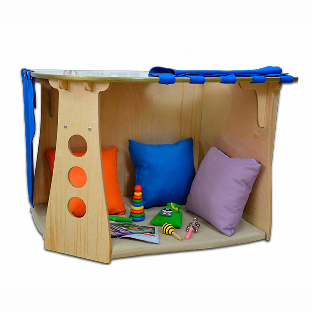Уютное местечко для обустройства детских игровых или сенсорных комнат. Это угловой домик, внутри которого легко размещаются мягкие модули. Подходит для малышей от трех лет. Изделие заинтересует каждого ребенка тем, что он сможет там отдыхать, играть и хранить игрушки.
