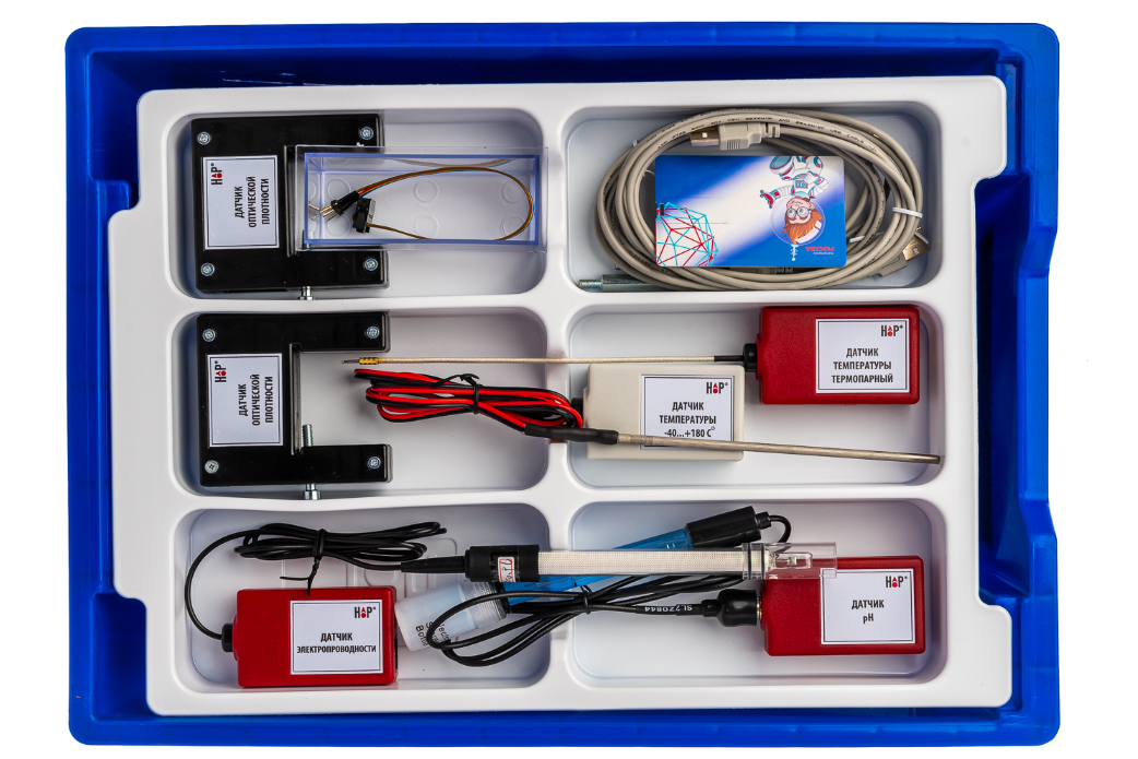 Комплект лаборатории позволяет проводить эксперименты инструментальными методами, с использованием цифровых датчиков и дополнительной оснастки.