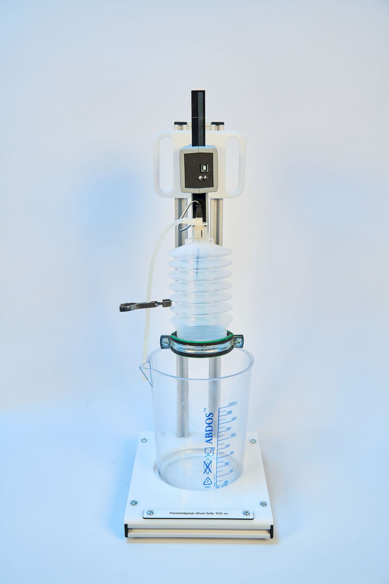 Лабораторная установка представляет собой герметичный резервуар, который смонтирован на вертикальной стойке таким образом, чтобы он мог быть погружен в резервуар с горячей или холодной водой. Герметичный резервуар имеет гофрированную боковую поверхность, обеспечивающую постоянство давления внутри резервуара за счет изменения его длины. Одно из оснований герметичного резервуара жестко связано с подвижным элементом датчика объема. Электронная схема датчика объема и датчика температуры смонтирована в едином корпусе. Датчик температуры обеспечивает измерение температуры газа, который находится в резервуаре. Квазистационарные условия изобарного процесса обеспечиваются при остывании предварительно нагретого резервуара на воздухе. Нагрев резервуара и, соответственно, находящегося в нем воздуха осуществляется при погружении его в горячую воду.