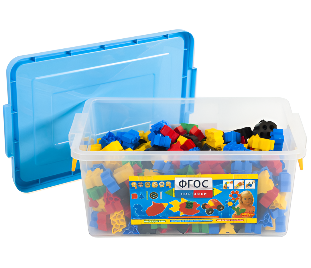 Конструктор упакован в ударопрочный пластиковый короб с крышкой и удобной ручкой для переноски и хранения деталей.